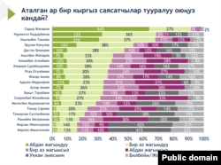 Ошондой эле сурамжылоого катышкандар “жакшы пикирде” деген саясатчылардын алдыңкы сабында Садыр Жапаров (64%), Нуржигит Кадырбеков (33%), Камчыбек Ташиев (31%), Эрулан Кокулов (16%) жана Дастан Бекешев (10%) турат.
