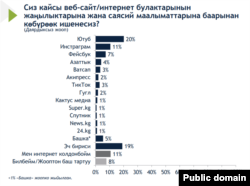 Андан тышкары, респонденттердин 20% маалыматты Ютубдан, Инстаграмдан 11%, Фейсбуктан 7%, “Азаттыктан” 4%, WhatsApp 3%, эки пайызы Akipress жана башка маалымат агенттиктерден ала турганын билдиришкен.