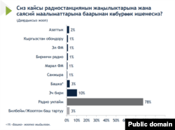 Сурамжылоого катышкандар “Азаттык” радиосунун жаңылыктарына жана саясий маалыматтарына көбүрөөк ишене турганын билдиришкен. Андан кийинки орундарда “Кыргызстан обондору", "Эл ФМ" “Биринчи радио”, “Марал ФМ” жана “Санжыра” радиолору бар.