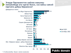 Ал эми “парламенттик шайлоо жакынкы жекшембиде өтө турган болсо кайсы партияга добуш бермексиз” деген суроого берилген жооптордо “Ата Журт Кыргызстан”, “Ыйман Нуру”, “Бүтүн Кыргызстан” алдыга чыккан.