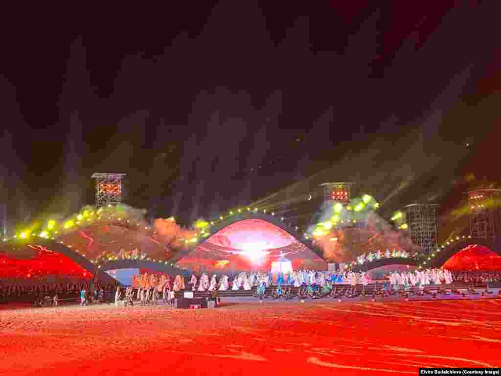 Салтанаттуу иш-чара түрк дүйнөсү менен көчмөндөрдүн маданиятын чагылдырган театралдаштырылган оюн-зоок менен башталды.