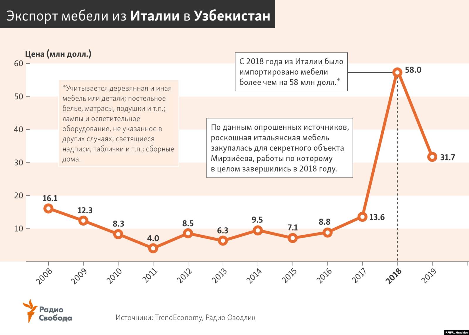 Маалыматта ошондой эле италиялык кайсы компаниялар эмерек экспорттогону же алардын Өзбекстанда кимдин колуна тийгени да айтылбайт.